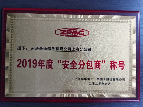 南通豪通船務(wù)上海分公司獲上海振華重工2019年度“安全分包商”稱號(hào)