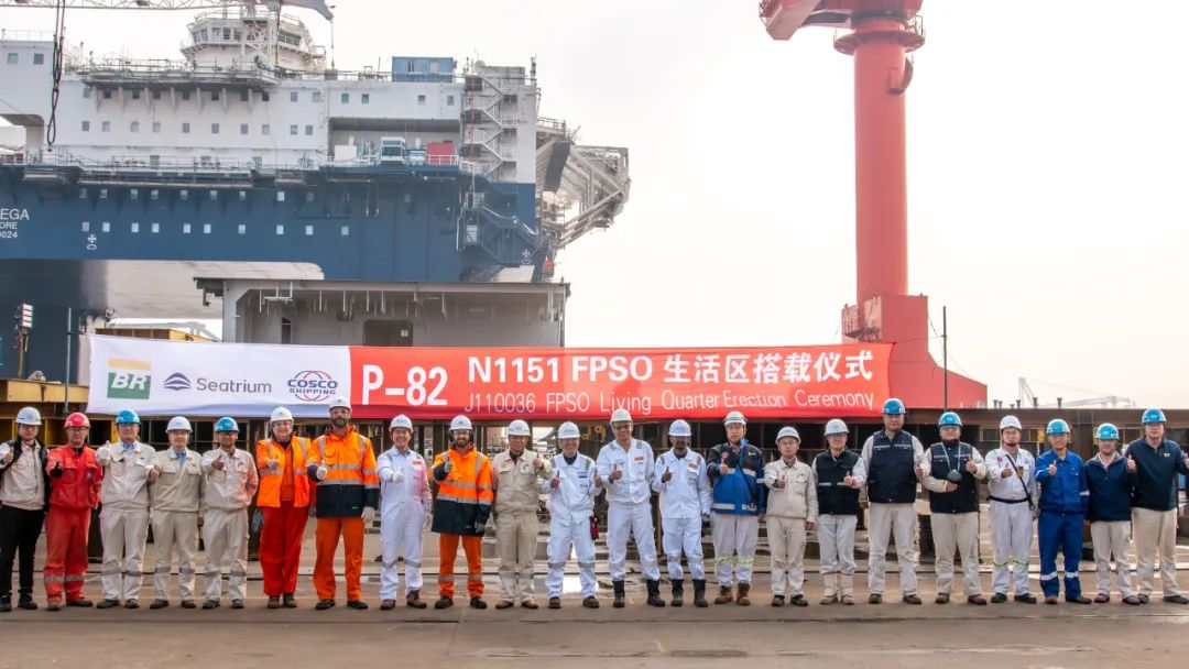 11月16日,啟東中遠(yuǎn)海運(yùn)海工舉行N1151 P-82 FPSO生活區(qū)模塊搭載儀式。船東方代表、ABS船級社代表、啟東中遠(yuǎn)海運(yùn)海工項目組成員參加了搭載儀式。